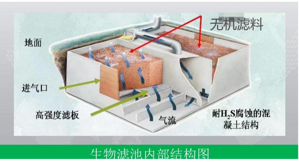 臭氣化合物,主要是硫化氫和有機(jī)氣體,向上流動(dòng)穿過(guò)生物濾池內(nèi)的濾料,生物濾料為經(jīng)優(yōu)化加工的無(wú)機(jī)濾料,將惡臭污染物徹底降解為H20和C02,實(shí)現(xiàn)總臭氣濃度控制。