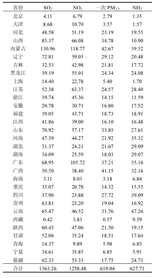 2010年全國(guó)氣象特征條件下,以我國(guó)333個(gè)地級(jí)城市PM2.5年均濃度達(dá)到環(huán)境空氣質(zhì)量標(biāo)準(zhǔn)為約束,各省四種污染物大氣環(huán)境容量(×10?t)