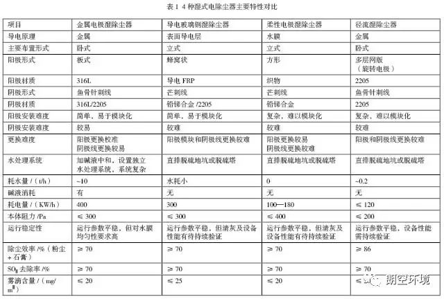 上述4種濕式電除塵器是目前國內(nèi)燃煤電廠普遍采用的高效除塵的終端精處理設(shè)備,其主要特性對比結(jié)果如表1所示(以300MW機(jī)組為例,數(shù)據(jù)僅供參考)。