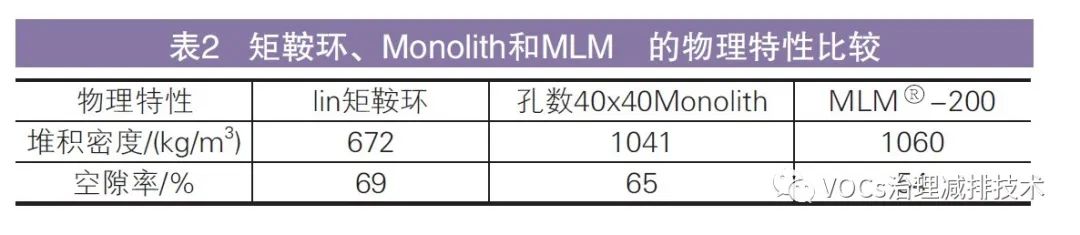 MLM®也是規(guī)整陶瓷填料,在同樣應用條件下與傳統(tǒng)的陶瓷矩鞍環(huán)相比,MLM®的床層壓降減少50%,因其阻力比陶瓷矩鞍環(huán)低,能耗可節(jié)省30%,在現(xiàn)有的蓄熱體中抗熱能力是比較強的一種,容易在短時間內達到400℃的變化溫度。陶瓷散堆填料(矩鞍環(huán))和規(guī)整填料(Monolith和MLM®)的物理特性比較如表2所示。在達到相同的熱效率條件下,MLM®所需的容積比Monolith少;在一定氣速條件下,其壓降比矩鞍環(huán)低。MLM®的價格比Monolith低,比矩鞍環(huán)高。用MLM®替代lin矩鞍環(huán)后,填料用量為lin矩鞍環(huán)的一半,在熱效率和切換周期時間保持不變,處理能力可提高30%。