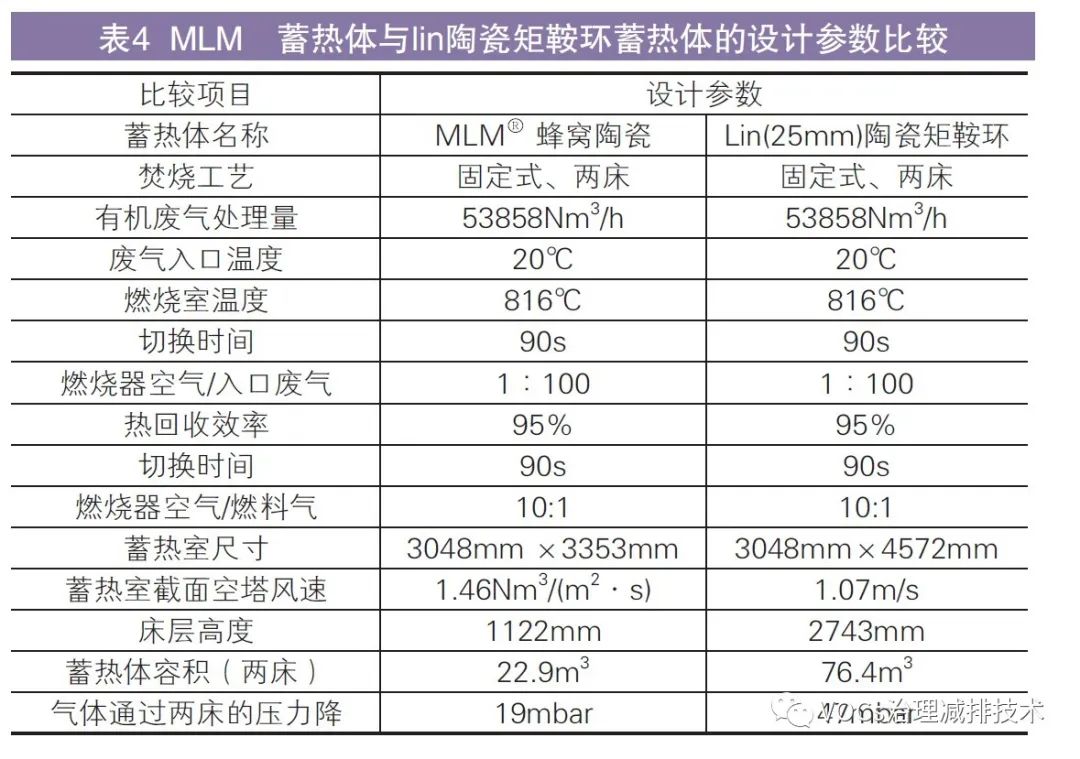 美國藍太克產品有限公司將MLM®蓄熱體用于RTO的設計參數(shù)與lin陶瓷矩鞍環(huán)的進行了比較,如表4所示。