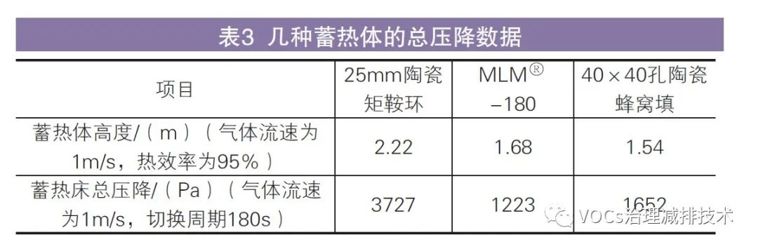 設計RTO裝置時,設備的體積主要由蓄熱床高度決定,風機功率由蓄熱床總壓降決定,表3為幾種蓄熱體的總壓降數(shù)據(jù)。從表3的數(shù)據(jù)可以看出,不同的蓄熱體,在相同的運行條件下,因床層高度帶來的床層總壓降差距較大。因此選擇蓄熱體是設計裝置的重要因素之一。