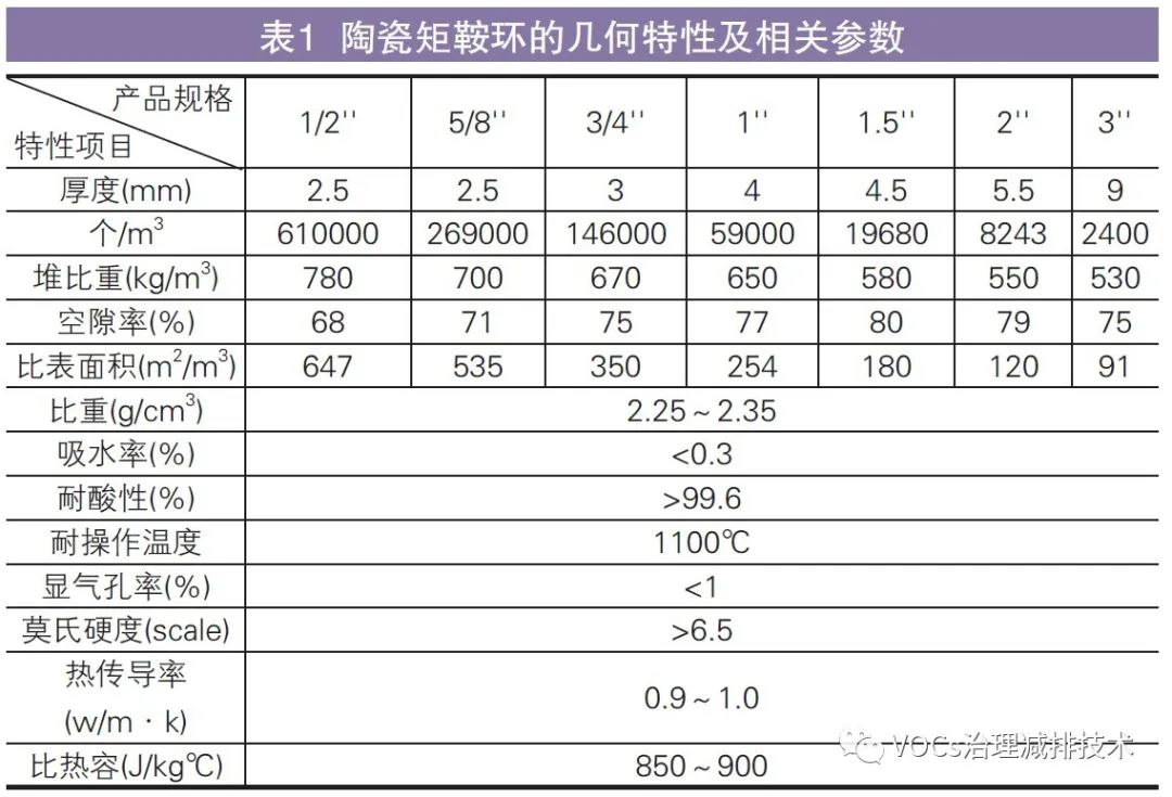 其床層具有較大的空隙率,床層內多為圓弧形液體通道,具有高的比重和耐酸耐熱性能。有關陶瓷矩鞍環(huán)產品的幾何特性及相關參數(shù)表1。