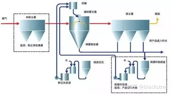該脫酸方法為通過石灰漿制備系統(tǒng)將生石灰制備成石灰漿溶液,然后通過一個(gè)水泵加壓到一個(gè)高速旋轉(zhuǎn)的霧化器將霧化的溶液均勻注入反應(yīng)塔內(nèi)與塔內(nèi)流動(dòng)的煙氣反應(yīng),去除酸性氣體。不做詳細(xì)解釋。