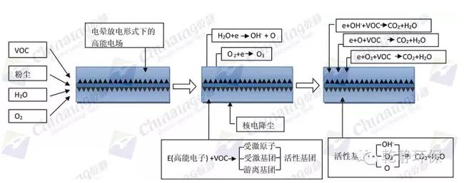 當放電過程中電子溫度很高,但重粒子溫度很低時,整個體系呈現(xiàn)低溫狀態(tài),所以稱為低溫等離子體。低溫等離子體降解污染物是利用這些高能電子、自由基等活性粒子氧化廢氣中的污染物,使污染物分子在極短的時間內(nèi)發(fā)生分解,并發(fā)生后續(xù)的各種反應以達到降解污染物的目的。
