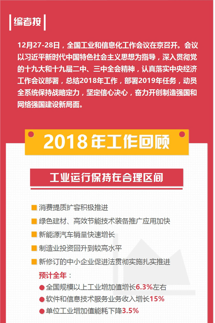 12月27日至28日,全國工業(yè)和信息化工作會議在京召開。會議回顧了2018年全年的工作,并對明年工信部重點工作進(jìn)行了部署與介紹。明年,工信部將持續(xù)推進(jìn)落后產(chǎn)能退出、落實污染防治攻堅戰(zhàn),實施綠色制造工程,深化“放管服”改革等。