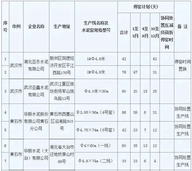 4月11日,湖北省經(jīng)信廳辦公室下達《關于2019年全省水泥企業(yè)錯峰生產(chǎn)計劃的通知》,湖北省經(jīng)信廳會同省生態(tài)環(huán)境廳對相關市(州)審核上報的水泥企業(yè)2019年錯峰生產(chǎn)備案計劃進行了審定。其中共有湖北亞東水泥、武漢亞鑫水泥等42家企業(yè)58個生產(chǎn)線參與錯峰生產(chǎn),2019全年共停窯3790天。