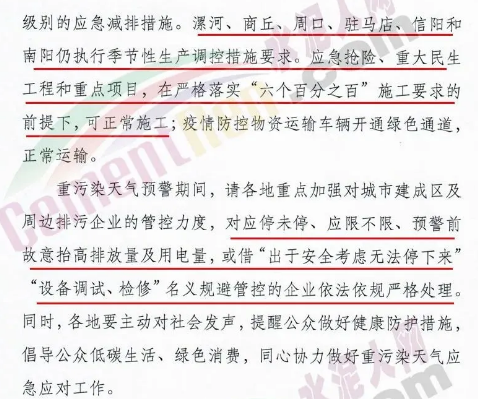 漯河、商丘、周口、駐馬店、信陽和南陽仍執(zhí)行季節(jié)性生產(chǎn)調(diào)控措施要求。應(yīng)急搶險、重大民生工程和重點(diǎn)項(xiàng)目,在嚴(yán)格落實(shí)“六個百分之百”施工要求的前提下,可正常施工。疫情防控物資運(yùn)輸車輛開通綠色通道,正常運(yùn)輸。