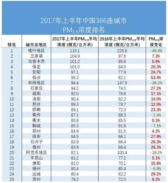 ?2017年上半年中國(guó)366座城市PM2.5濃度排名前25名