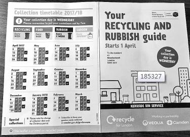 對(duì)于垃圾分類和垃圾回收時(shí)間,區(qū)政府給每個(gè)家庭都印制了專門(mén)的小冊(cè)子。由于沒(méi)有“讀懂吃透”區(qū)政府的“垃圾回收指南”,記者在倫敦生活的第一周便被工人拒收垃圾。上門(mén)回收垃圾的工人,在記者盛放可回收垃圾的綠色垃圾桶上,留下了一張拒收垃圾的說(shuō)明,上面寫(xiě)道:“由于您的垃圾桶內(nèi)放置了不可回收使用的物品,我們無(wú)法回收,請(qǐng)您遵照以下說(shuō)明,重新清理垃圾桶內(nèi)物品。”
