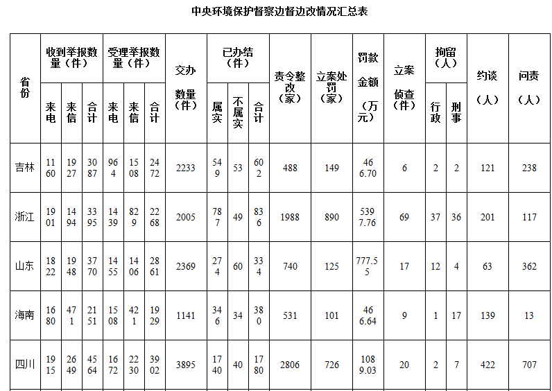 截至8月24日,8個環(huán)保督察組共收到群眾舉報20343件,受理有效舉報15813件,經(jīng)梳理合并重復舉報,累計向被督察地區(qū)交辦轉(zhuǎn)辦13826件;各被督地區(qū)完成查處4869件,其中立案處罰2115家,處罰金額9449.24萬元;立案偵查122件,拘留146人;約談1113人,問責1797人。通過邊督邊改,解決了一批群眾身邊的環(huán)境問題,人民群眾有了獲得感,并給予督察組和地方黨委、政府好評。