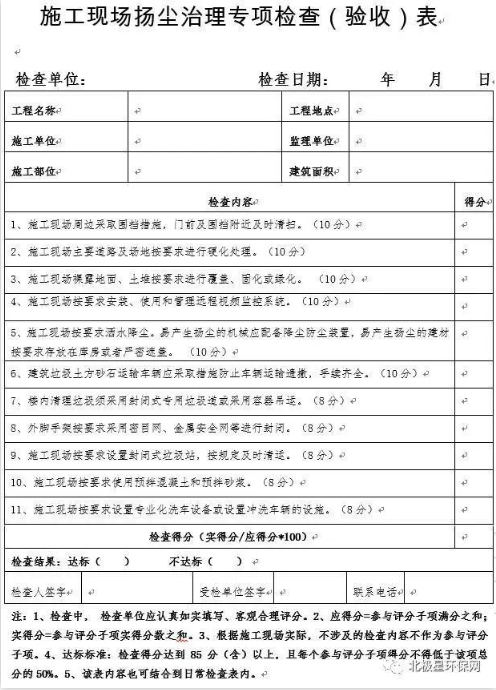 7.施工現(xiàn)場(chǎng)揚(yáng)塵治理檢查標(biāo)準(zhǔn)統(tǒng)一參照《施工現(xiàn)場(chǎng)揚(yáng)塵治理專(zhuān)項(xiàng)檢查(驗(yàn)收)表》(見(jiàn)附件),檢查得分達(dá)到85分(含)以上,且每個(gè)參與評(píng)分子項(xiàng)得分不得低于該項(xiàng)總分的50%即為達(dá)標(biāo),低于上述標(biāo)準(zhǔn)為不達(dá)標(biāo)。
