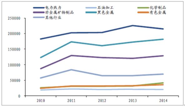 2010-2014年各行業(yè)工業(yè)廢氣排放量(億立方米)