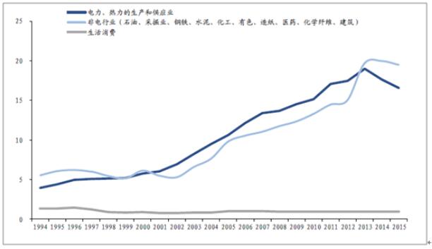 國家統(tǒng)計局?jǐn)?shù)據(jù)顯示,2014年非電行業(yè)廢氣排放遠超電力行業(yè),電力行業(yè)排放量僅占全行業(yè)排放量31%,其余69%的廢氣由鋼鐵、水泥、化工、有色等非電行業(yè)貢獻。2010年至2014年五年間,大部分行業(yè)廢氣排放量呈上升趨勢;在2014年,僅有電力行業(yè)出現(xiàn)了明顯的廢氣排放量下降,降幅達4.59%,而其余行業(yè)廢氣排量除石油行業(yè)外均出現(xiàn)了5%以上的增幅,未見減排效果。我們通過對煤炭消費量的比較發(fā)現(xiàn),2015年電力行業(yè)煤炭消費量進一步減少,達到16.54億噸,相較2013年已減少12.89%;而2015年非電領(lǐng)域煤炭消費量(我們選取煤炭消費量較大的十個行業(yè)進行加總)達到19.50億噸,相比2013年僅減少了0.92%。由此推測,2015年非電行業(yè)廢氣排放量占全行業(yè)廢氣排放量的比例將超過2014年的69%,超過七成。