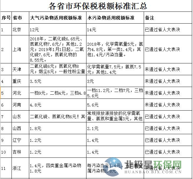 最新各省市環(huán)保稅額標準匯總