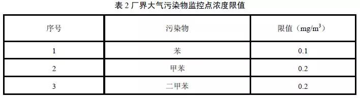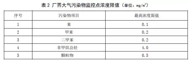 廠界大氣污染物監(jiān)控點(diǎn)污染物濃度限值應(yīng)符合表2規(guī)定。
