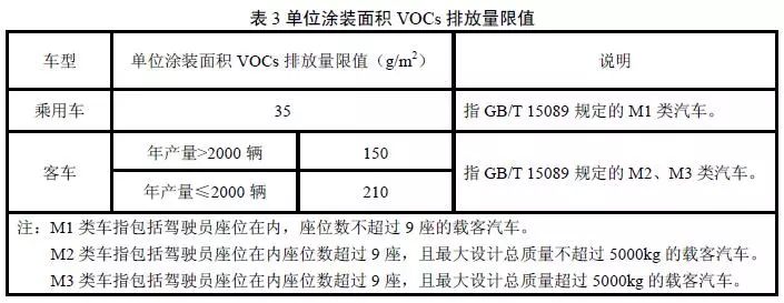 單位涂裝面積VOCs排放量限值應(yīng)符合表3規(guī)定。