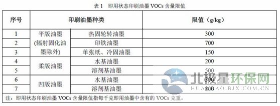 印刷生產(chǎn)過程使用的即用狀態(tài)印刷油墨的VOCs含量限值執(zhí)行表1規(guī)定。