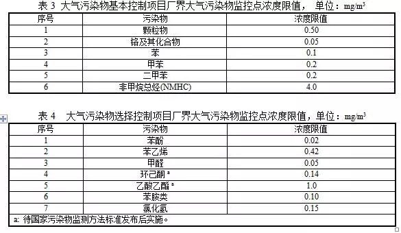 廠界大氣污染物監(jiān)控點(diǎn)濃度限值執(zhí)行表3和表4中廠界大氣污染物監(jiān)控點(diǎn)濃度限值。