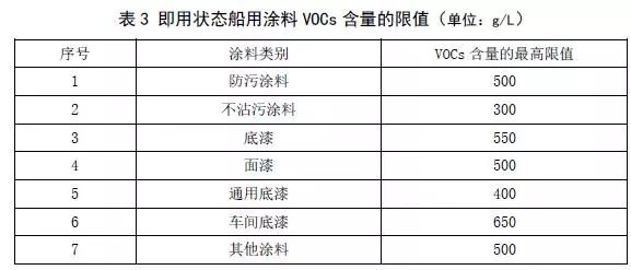 船用涂料VOCs含量限值執(zhí)行表3規(guī)定的即用狀態(tài)船用涂料VOCs含量限值。