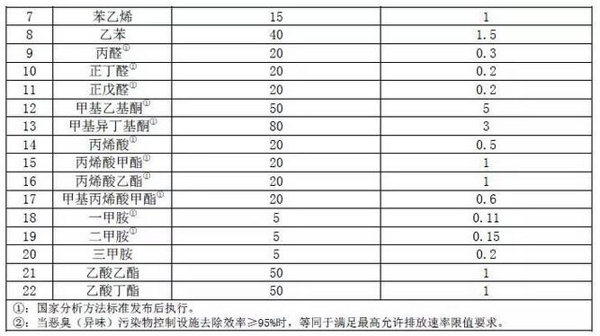 有組織排放限值:現(xiàn)有源自2018年7月1日起執(zhí)行表1和表2中規(guī)定的惡臭(異味)污染物排放限值。新源自2017年2月1日起執(zhí)行表1和表2中規(guī)定的惡臭(異味)污染物排放限值。