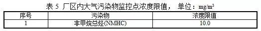 廠區(qū)內(nèi)大氣污染物監(jiān)控點(diǎn)濃度限值執(zhí)行表5中廠區(qū)內(nèi)大氣污染物監(jiān)控點(diǎn)濃度限值。