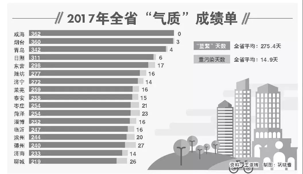 自2013年以來山東省空氣質(zhì)量持續(xù)改善。2017年,全省4項大氣主要污染物指標(biāo)同比均呈持續(xù)改善的良好態(tài)勢:PM2.5平均濃度為57微克/立方米,同比改善13.6%;PM10平均濃度為106微克/立方米,同比改善11.7%;二氧化硫平均濃度為24微克/立方米,同比改善31.4%;二氧化氮平均濃度為37微克/立方米,同比改善2.6%,煤炭消費總量壓減2706萬噸。