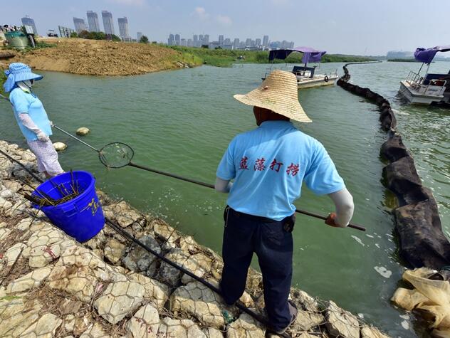 2017年7月29日上午,安徽省合肥市巢湖邊兩位工人正在清理湖面雜物。攝影/章軻