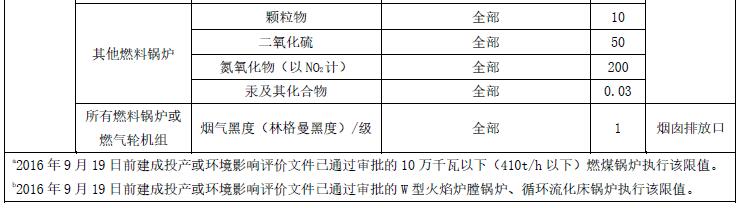 2016年9月19日前建成投產(chǎn)或環(huán)境影響評(píng)價(jià)文件已通過(guò)審批的燃煤鍋爐,2016年12月31日前建成投產(chǎn)或環(huán)境影響評(píng)價(jià)文件已通過(guò)審批的燃油、燃?xì)忮仩t或燃?xì)廨啓C(jī)組及其他燃料鍋爐,自本標(biāo)準(zhǔn)實(shí)施之日起至2019年12月31日止,不分控制區(qū)執(zhí)行表1中的排放濃度限值。