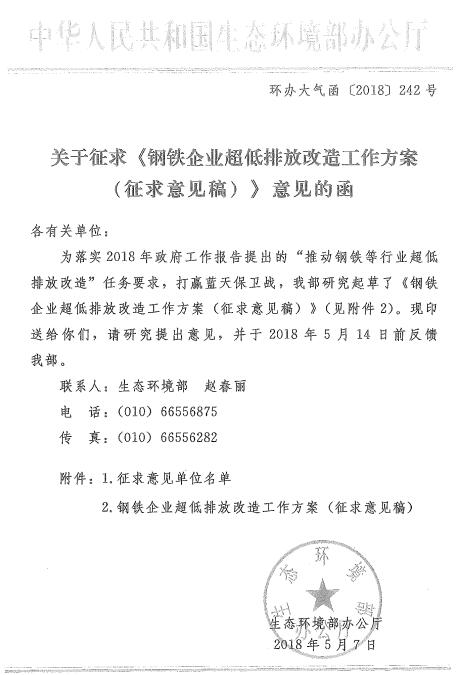 生態(tài)環(huán)境部:關(guān)于征求《鋼鐵企業(yè)超低排放改造工作方案(征求意見稿)》意見的函