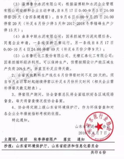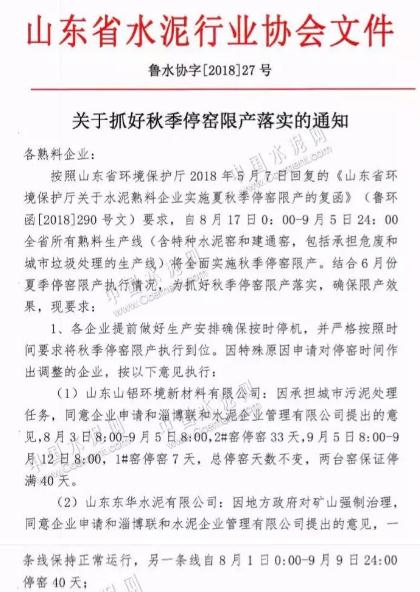 8月7日,山東水泥協(xié)會發(fā)布《關(guān)于抓好秋季停窯限產(chǎn)的通知》(下稱《通知》)?!锻ㄖ繁硎景凑铡渡綎|省環(huán)境保護廳關(guān)于水泥熟料企業(yè)實施夏秋季停窯限產(chǎn)的復函》(魯環(huán)函【2018】290號文)的要求,從8月17日零時開始至9月5日24時,全省所有熟料生產(chǎn)線(含特種水泥窯和建通窯,包括承擔危廢和城市生活垃圾處理的生產(chǎn)線)全面實施停窯限產(chǎn)。