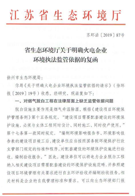 江蘇:關(guān)于明確火電企業(yè)環(huán)境執(zhí)法監(jiān)管依據(jù)的復(fù)函-煙氣脫白丨排放限值