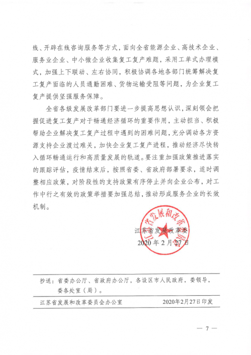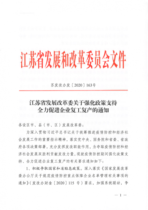 江蘇省發(fā)展改革委提出了促進(jìn)企業(yè)復(fù)工復(fù)產(chǎn)的15條政策舉措,經(jīng)第49次委黨組會(huì)審議通過,向各設(shè)區(qū)市、縣(市、區(qū))發(fā)展改革委印發(fā)了《江蘇省發(fā)展改革委關(guān)于強(qiáng)化政策支持 全力促進(jìn)企業(yè)復(fù)工復(fù)產(chǎn)的通知》(蘇發(fā)改辦發(fā)﹝2020﹞163號(hào))。