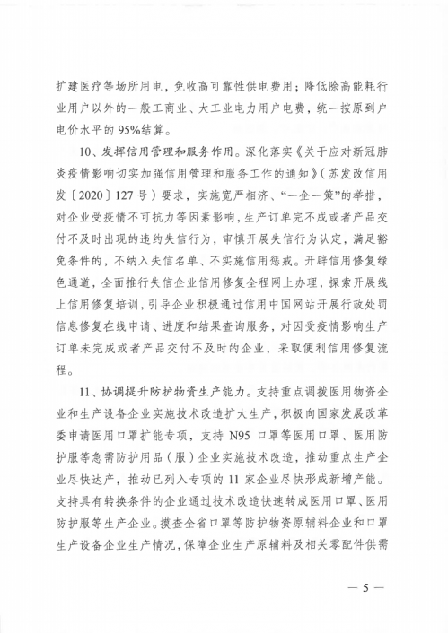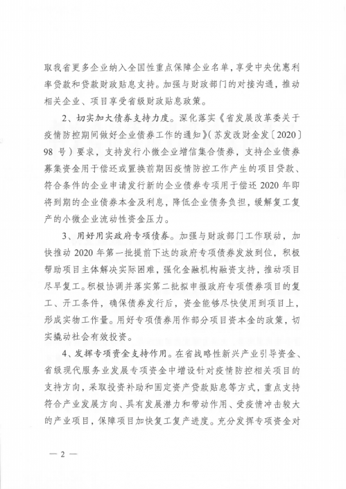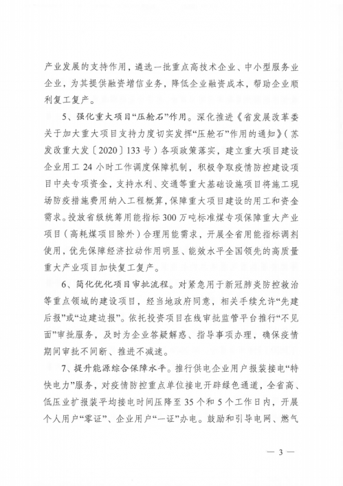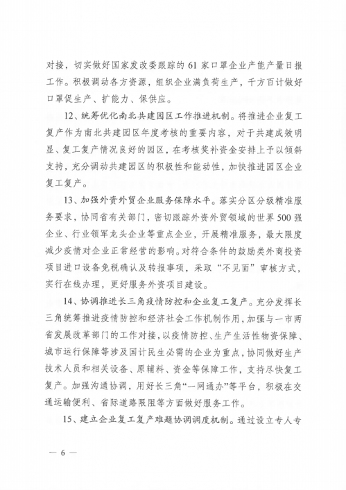 《通知》要求,疫情防控期間從十五個(gè)方面強(qiáng)化政策支持,全力促進(jìn)企業(yè)復(fù)工復(fù)產(chǎn)。包括:積極爭(zhēng)取國(guó)家和江蘇省貼息政策;切實(shí)加大債券支持力度,緩解復(fù)工復(fù)產(chǎn)企業(yè)流動(dòng)性資金壓力;用好用實(shí)政府專項(xiàng)債券,切實(shí)撬動(dòng)社會(huì)有效投資;發(fā)揮專項(xiàng)資金支持作用,幫助企業(yè)復(fù)工復(fù)產(chǎn);強(qiáng)化重大項(xiàng)目“壓艙石”作用;簡(jiǎn)化優(yōu)化項(xiàng)目審批流程;提升能源綜合保障水平;深化落實(shí)降費(fèi)減負(fù)措施;降低復(fù)工企業(yè)用能成本;發(fā)揮信用管理和服務(wù)作用;協(xié)調(diào)提升防護(hù)物資生產(chǎn)能力;統(tǒng)籌優(yōu)化南北共建園區(qū)工作推進(jìn)機(jī)制;加強(qiáng)外資外貿(mào)企業(yè)服務(wù)保障水平;協(xié)調(diào)推進(jìn)長(zhǎng)三角疫情防控和企業(yè)復(fù)工復(fù)產(chǎn);建立企業(yè)復(fù)工復(fù)產(chǎn)難題協(xié)調(diào)調(diào)度機(jī)制。