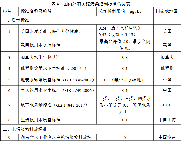 5.1國內外相關標準及情況目前,國內及國外涉及鉈含量的環(huán)境質量標準或排放標準相對較少,具體見表4。對于環(huán)境質量標準,美國飲用水水質標準中規(guī)定飲用水中鉈含量最高允許值為2.0μg/L,最安全閾值為0.5μg/L;我國《地表水環(huán)境質量標準》(GB3838-2002)中集中式生活飲用水地表水源地特定項目鉈含量標準限值為0.1μg/L,《生活飲用水衛(wèi)生標準》(GB5749-2006)規(guī)定飲用水中標準限值為0.1μg/L。對污染物排放標準,美國含鉈危險廢物最佳示范技術背景文件中規(guī)定一價鉈化合物經化學氧化-沉淀-過濾后,測量24小時混合水樣廢水鉈含量治理標準為140μg/L。