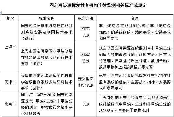 我國(guó)在揮發(fā)性有機(jī)物監(jiān)測(cè)方面也出臺(tái)了一系列監(jiān)測(cè)標(biāo)準(zhǔn)。各地針對(duì)固定污染源揮發(fā)行有機(jī)物連續(xù)監(jiān)測(cè)相繼出臺(tái)了技術(shù)規(guī)范。