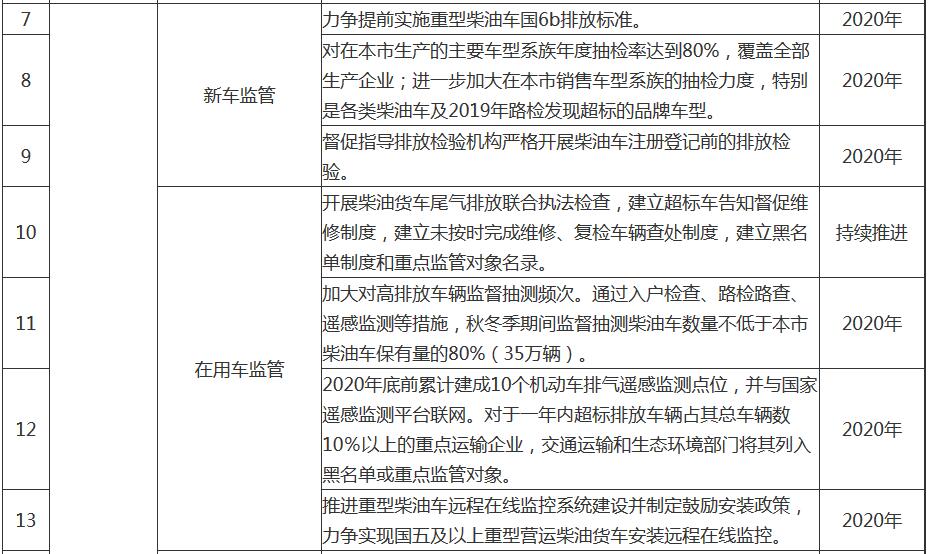 7. 加強(qiáng)在用車監(jiān)管力度。加快推進(jìn)國五及以上重型柴油車安裝遠(yuǎn)程在線監(jiān)控并與生態(tài)環(huán)境部門聯(lián)網(wǎng),督促柴油車超過20輛的重點企業(yè)完善車輛維護(hù)、燃料和車用尿素添加使用臺賬,秋冬季期間監(jiān)督抽測柴油車數(shù)量不低于35萬輛,2020年底前累計建成10個機(jī)動車排氣遙感監(jiān)測點位。