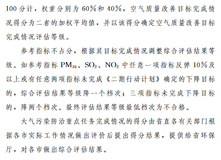 第四條評估采用評分法,空氣質(zhì)量改善目標(biāo)完成情況和大氣污染防治重點任務(wù)完成情況滿分均按滿分100分計,綜合評估結(jié)果為二者的加權(quán)平均值,權(quán)重分別為60%和40%。評估結(jié)果分為優(yōu)秀、良好、合格、不合格四個等級,其中,評分結(jié)果90分及以上為優(yōu)秀、70分(含)至90分為良好、60分(含)至70分為合格、60分以下為不合格。根據(jù)參考指標(biāo)目標(biāo)完成情況調(diào)整綜合評估結(jié)果等級作為最終評估結(jié)果。參考指標(biāo)PM10、SO2、NO2中任意一項指標(biāo)反彈10%及以上或有任意兩項指標(biāo)未完成《二期行動計劃》確定的下降目標(biāo)的,綜合評估結(jié)果等級降一個檔次;三項指標(biāo)未完成下降目標(biāo)的,降兩個檔次。最終評估結(jié)果等級最低檔次為不合格。
