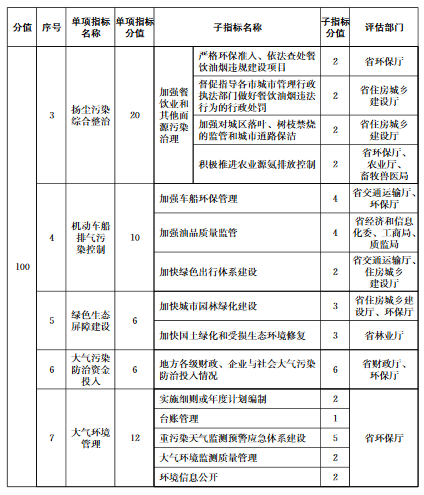 大氣污染防治重點任務(wù)完成情況包括能源和產(chǎn)業(yè)結(jié)構(gòu)調(diào)整、工業(yè)污染綜合治理、揚塵污染綜合整治、機(jī)動車船排氣污染控制、綠色生態(tài)屏障建設(shè)、大氣污染防治資金投入、大氣環(huán)境管理等7項指標(biāo)。大氣污染防治重點任務(wù)完成情況各指標(biāo)的定義、評估要求和計分方法等由有關(guān)評估部門按照《二期行動計劃》的職責(zé)分工確定,評估部門根據(jù)子指標(biāo)分值對各市重點任務(wù)進(jìn)行打分,并向省環(huán)保廳提供評分結(jié)果。評估部門為兩個部門以上的,各評估部門分別打分后取平均值作為本項重點任務(wù)得分。