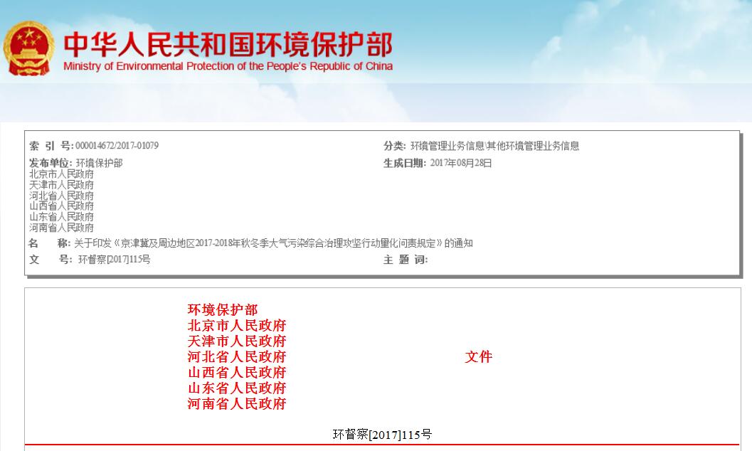 從環(huán)保部獲悉,環(huán)保部聯(lián)合六省市印發(fā)《京津冀及周邊地區(qū)2017-2018年秋冬季大氣污染綜合治理攻堅(jiān)行動(dòng)量化問責(zé)規(guī)定》。全文如下: